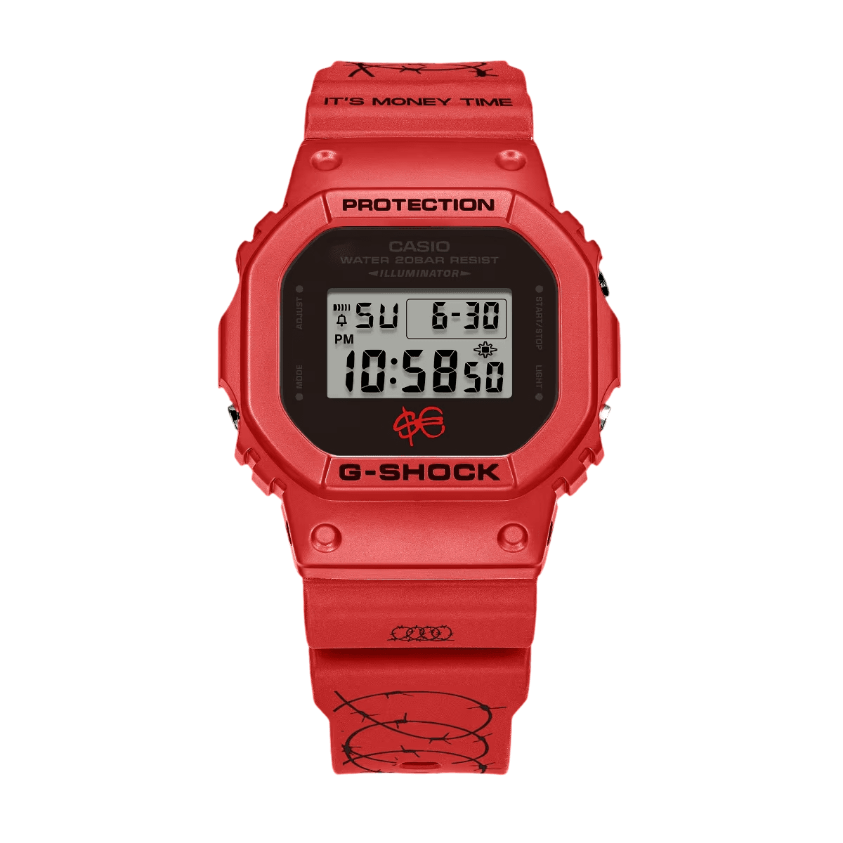 La partnership tra Sfera Ebbasta e G-SHOCK fonde perfettamente il percorso creativo dell’Artista con la tradizione e l'innovazione ingegneristica di G-SHOCK. Audace e meticolosamente rifinito, questo orologio è l'accessorio definitivo per chi vive al massimo ed è #BuiltDifferent. Questa esclusiva collaborazione vede Sfera Ebbasta reinterpretare e personalizzare due casse storiche di G-SHOCK, la serie 5600 e 6900. Ogni dettaglio racconta una storia, il cinturino è caratterizzato da un motivo a filo spinato, aggiungendo un tocco di streetwear al design indistruttibile di G-SHOCK. Il mantra “It’s Money Time” è impresso sul cinturino, il logo $€ è inciso con cura sul fondello ed è presente sulla cassa dell’orologio. La retroilluminazione, personalmente scelta dall’artista di colore rosso, tinta distintiva e simbolica di Sfera Ebbasta, svela magicamente il logo $€ sul quadrante. Tutti i dettagli conferiscono esclusività a questi modelli, rendendoli unici. Sfera Ebbasta ha infuso nel design di questi orologi un'energia unica, scegliendo come palette il rosso intenso e il nero, con elementi cromatici inversi per un look che non passa inosservato. Due modelli iconici, due colorazioni speculari, pensati per chi vuole ridefinire le proprie regole. It’s Money Time!