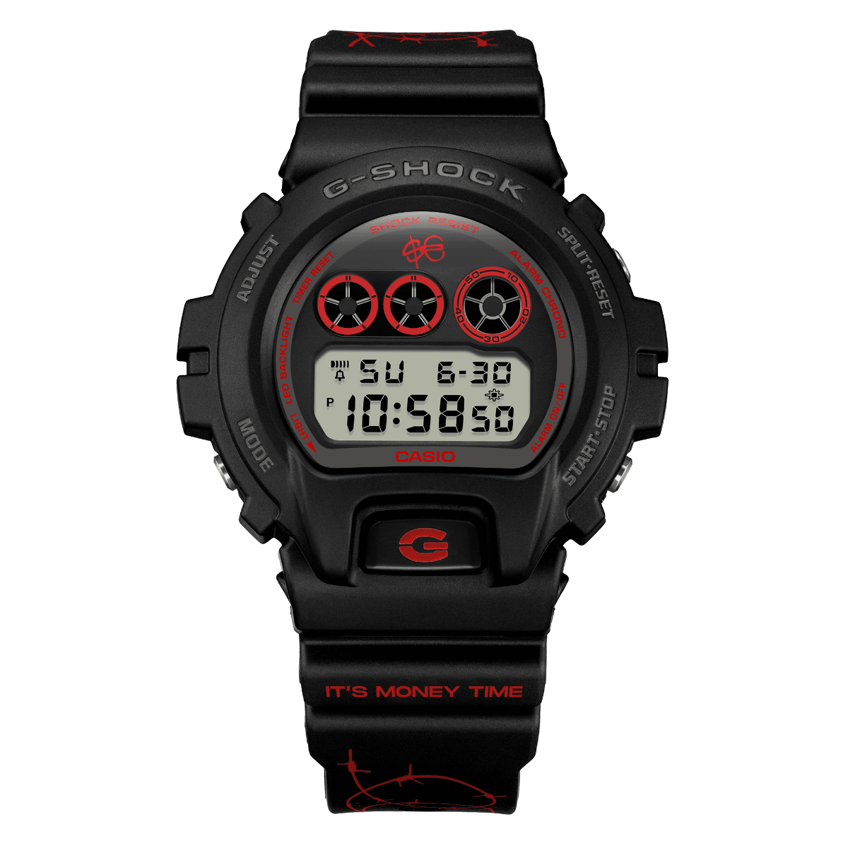 La partnership tra Sfera Ebbasta e G-SHOCK fonde perfettamente il percorso creativo dell’Artista con la tradizione e l'innovazione ingegneristica di G-SHOCK. Audace e meticolosamente rifinito, questo orologio è l'accessorio definitivo per chi vive al massimo ed è #BuiltDifferent. Questa esclusiva collaborazione vede Sfera Ebbasta reinterpretare e personalizzare due casse storiche di G-SHOCK, la serie 5600 e 6900. Ogni dettaglio racconta una storia, il cinturino è caratterizzato da un motivo a filo spinato, aggiungendo un tocco di streetwear al design indistruttibile di G-SHOCK. Il mantra “It’s Money Time” è impresso sul cinturino, il logo $€ è inciso con cura sul fondello ed è presente sulla cassa dell’orologio. La retroilluminazione, personalmente scelta dall’artista di colore rosso, tinta distintiva e simbolica di Sfera Ebbasta, svela magicamente il logo $€ sul quadrante. Tutti i dettagli conferiscono esclusività a questi modelli, rendendoli unici. Sfera Ebbasta ha infuso nel design di questi orologi un'energia unica, scegliendo come palette il rosso intenso e il nero, con elementi cromatici inversi per un look che non passa inosservato. Due modelli iconici, due colorazioni speculari, pensati per chi vuole ridefinire le proprie regole. It’s Money Time!