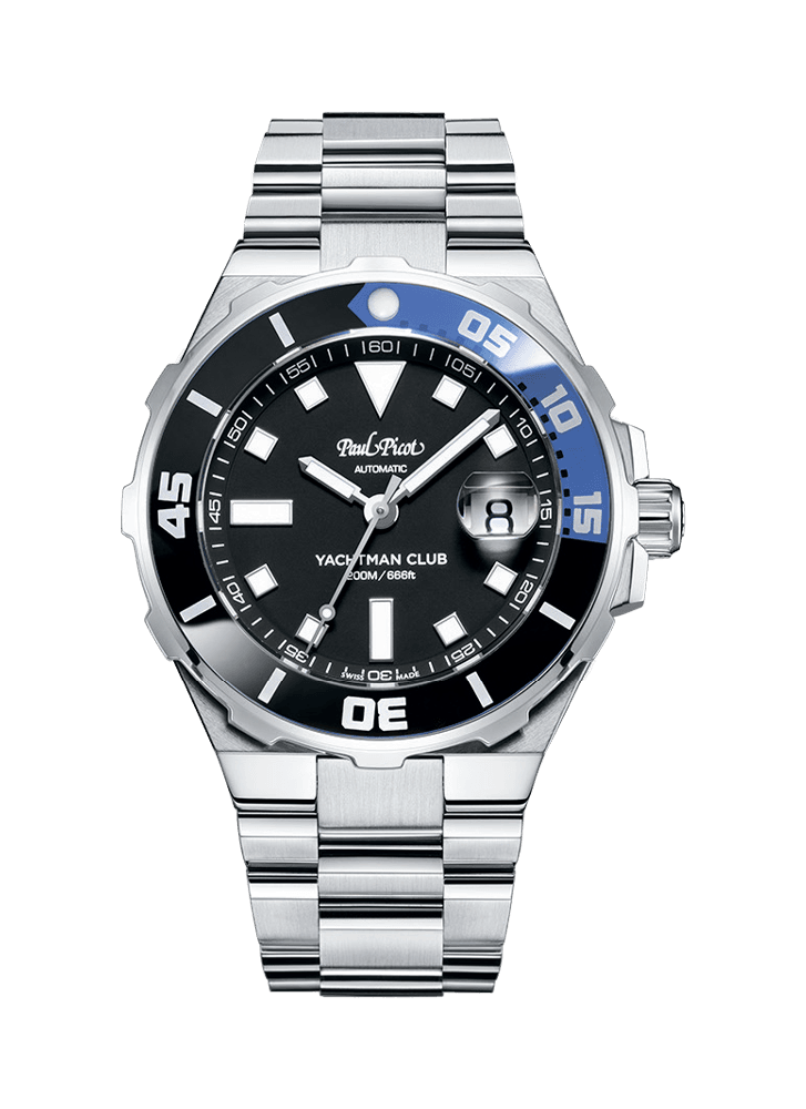 Orologio da Uomo solo tempo PAUL PICOT della collezione Yachtman Club con movimento meccanico automatico Swiss Made, cassa 43 mm in acciaio inox, ghiera unidirezionale in vetro zaffiro di colore nero e azzurro, quadrante nero e datario a finestrella con lente d’ingrandimento ad ore 3, lancette e indici hanno un rivestimento fluorescente e si illuminano al buio dopo lo spegnimento di una fonte luminosa, riserva di carica 38 ore e vetro zaffiro antigraffio e antiriflesso. Il cinturino è in acciaio inox con finitura lucida e satinata e monta una chiusura deployante con doppio pulsante. Fondello e corona serrati a vite per una maggiore garanzia di impermeabilità. Orologio impermeabile a 20 ATM, quindi è adatto per immersione in apnea senza attrezzatura.
